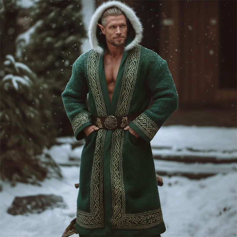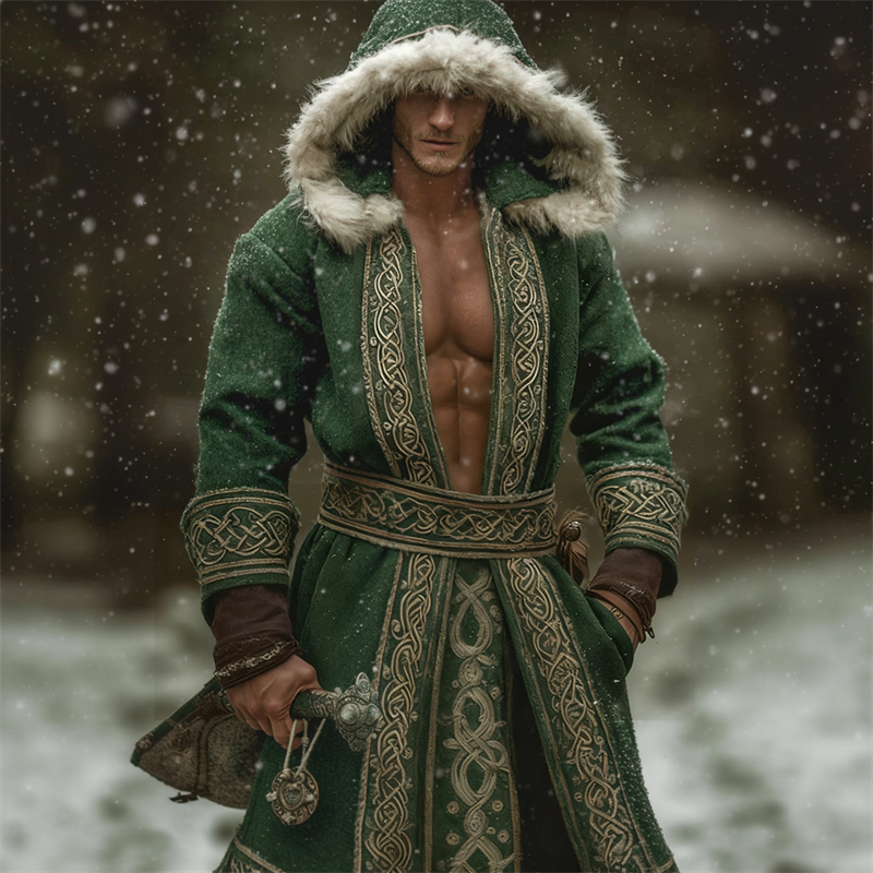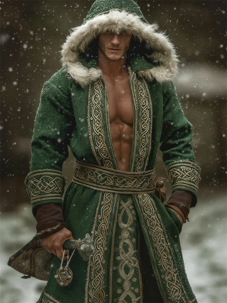 Men's Christmas Inspired Viking Celtic Fur Trim Hooded Cardigan