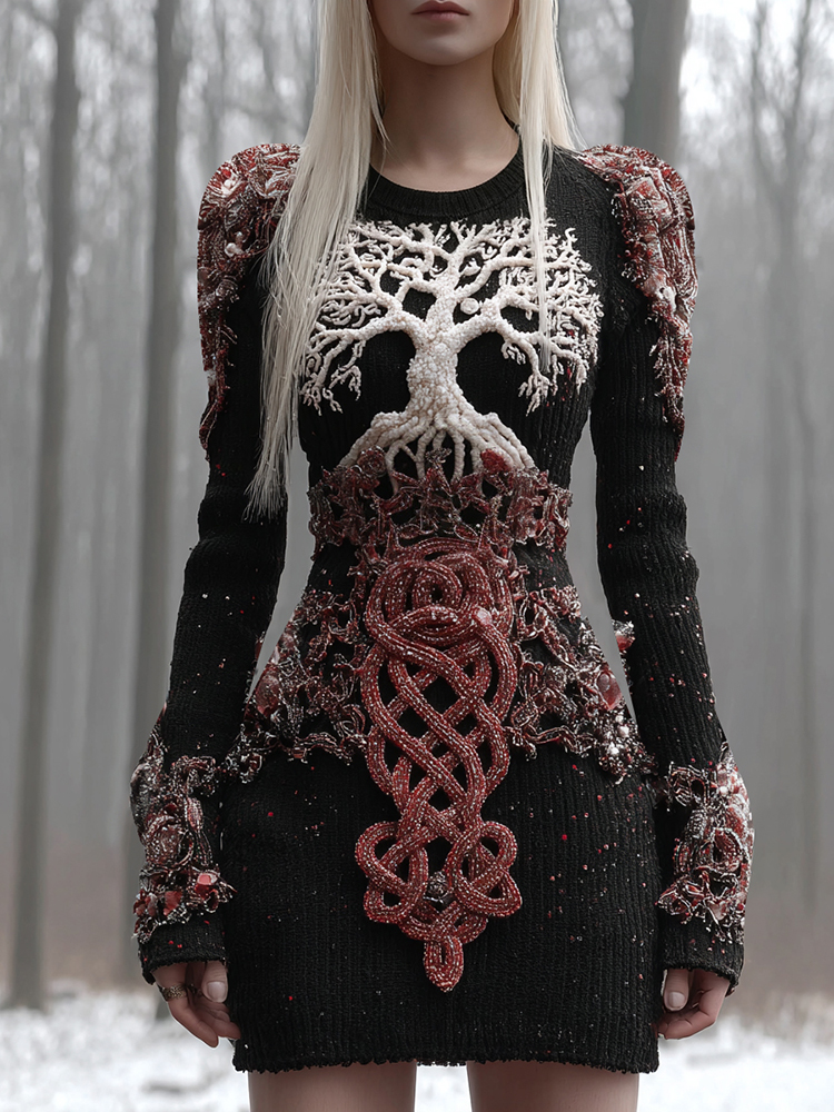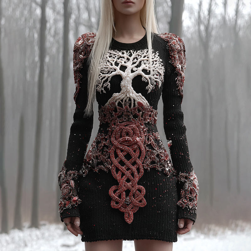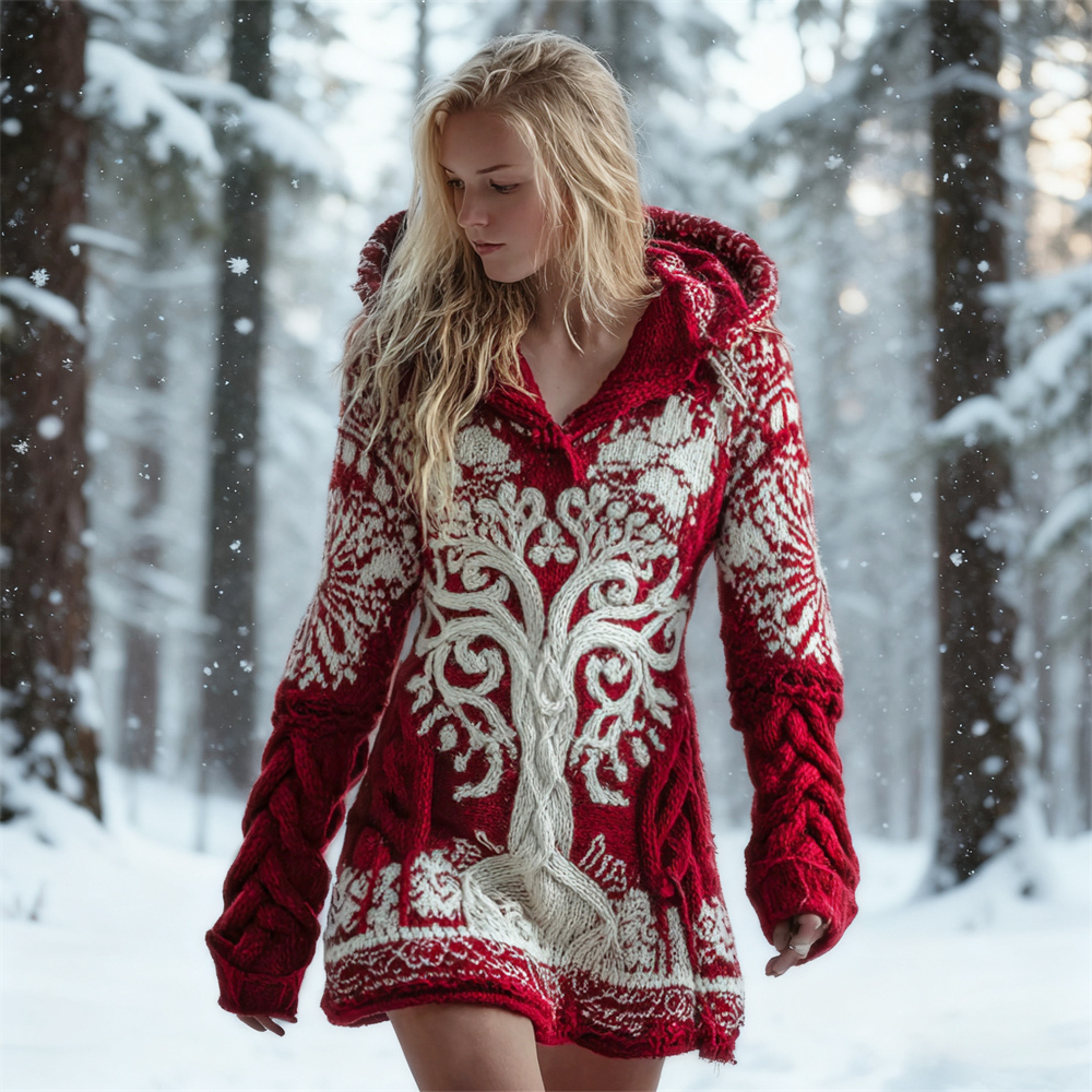 Women's Viking Tree Of Life Knit Hooded Mini Dress